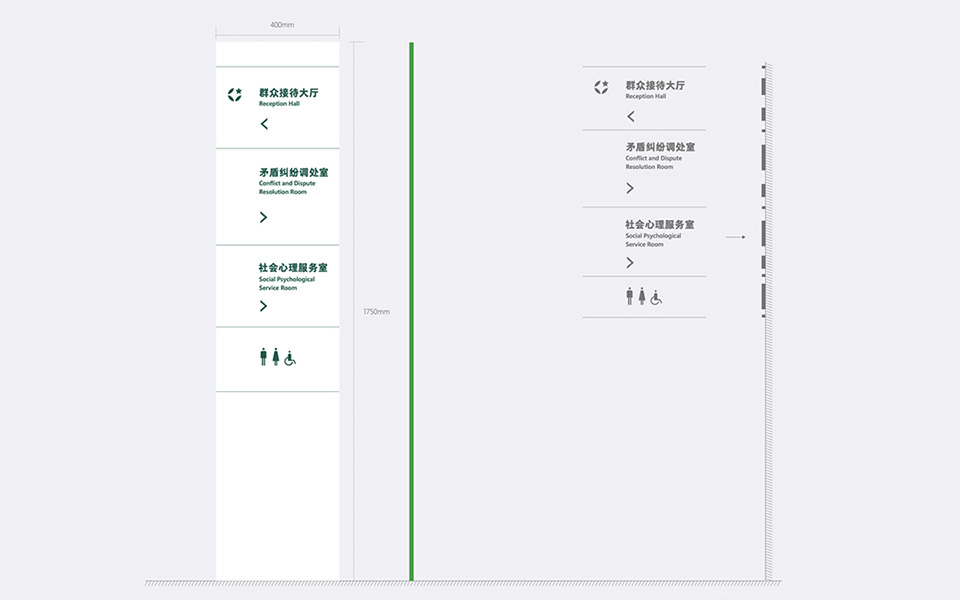 柔和的暖色与干净高雅的白色以及形象标准色平和绿共同塑造出令人倍感亲切温馨的接待氛围,最终营造出兼具专业规范与人文关怀的服务场景,让来访者在安全有序的空间体验中,自然感知到机构严谨而不失温度的服务内核。