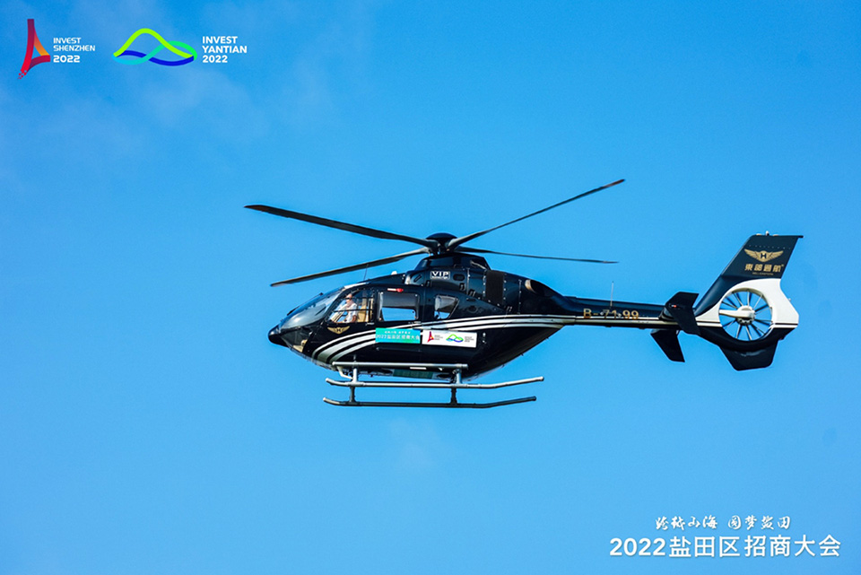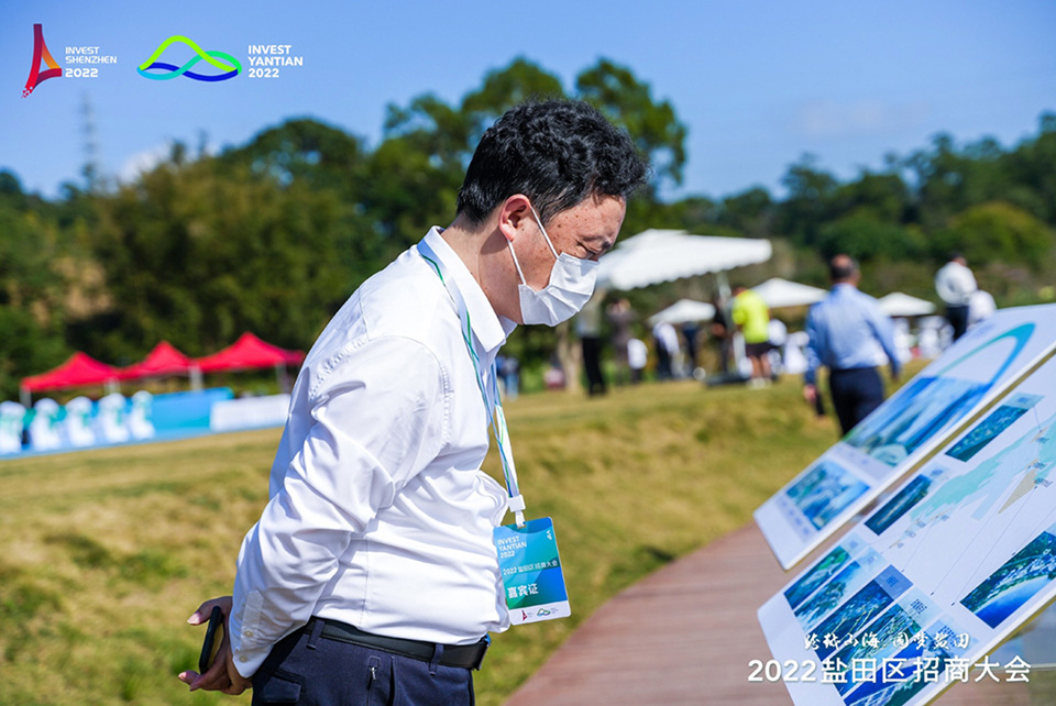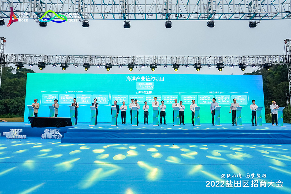 有别于往年的招商大会,本次大会整个会场布置紧扣活动主题,处处可见盐田元素,大会LOGO以三条曲线组成的图形,呈现滨海城区“山海相依、一半山海一半城”的景象。置放于水清林翠自然湿地生态间的宣传展板,凸显了盐田区水陆相连、人文相融的深港合作优势,倚山拥海、水清岸绿的生态环境优势,以及特色鲜明、基础扎实的产业发展优势。此外,主会场还进行了“东部通航”直升机表演,“扶摇直上”的直升机,搭建了一条政企合作共赢的桥梁纽带,寄托着盐田区对企业发展“蒸蒸日上、再创辉煌”的美好祝福。②
